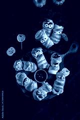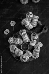 Halloween food. Scary sausage mummies in dough with funny eyes on dark background. Funny decoration. Top view