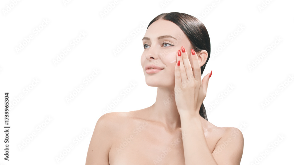 A woman with radiant skin smiles confidently, embodying beauty, skincare, and self-care ideals. White background with copy space for your message.