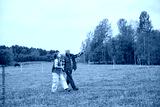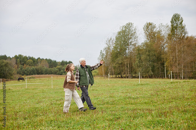 Senior Caucasian man and young adult Caucasian woman walking together in grassy field, man pointing toward distance, both appearing relaxed and engaged in outdoor activity, trees in background