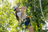 Young child teen girl on high ropes adventure course wearing a helmet and safety harness holding a line, climbing through obstacles forest rope climbing park summer outdoor activity, smiling at camera