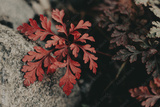 Vibrant red leaves in a natural, moody forest setting. The image captures the beauty of nature with striking red and purple leaves Autumnal background