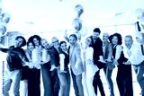 Diverse professional team in formal attire celebrating in an office setting with balloons symbolizing creativity and teamwork