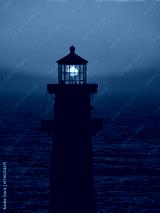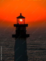 Pigeon Point Lighthouse in California silhouetted against an orange sunset, with the sun aligned in the lantern room and the calm ocean in the background.