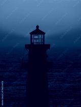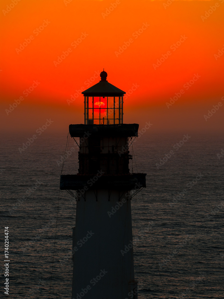 Pigeon Point Lighthouse is silhouetted against an orange and red sunset, with the sun aligned in the lantern room. The calm ocean lies in the background.