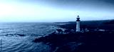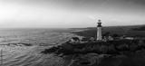 Aerial view of Pigeon Point Lighthouse on a rocky California coastline during sunset, with ocean waves, a glowing horizon, and surrounding greenery.