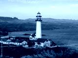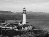 Pigeon Point Lighthouse stands on California's rugged coast, with its red topped lantern room, historic buildings, and cliffs lit by a golden sunset.