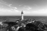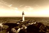 Pigeon Point Lighthouse stands tall on California's coastline, surrounded by small buildings, greenery, and the ocean under a golden sunset sky.