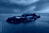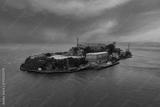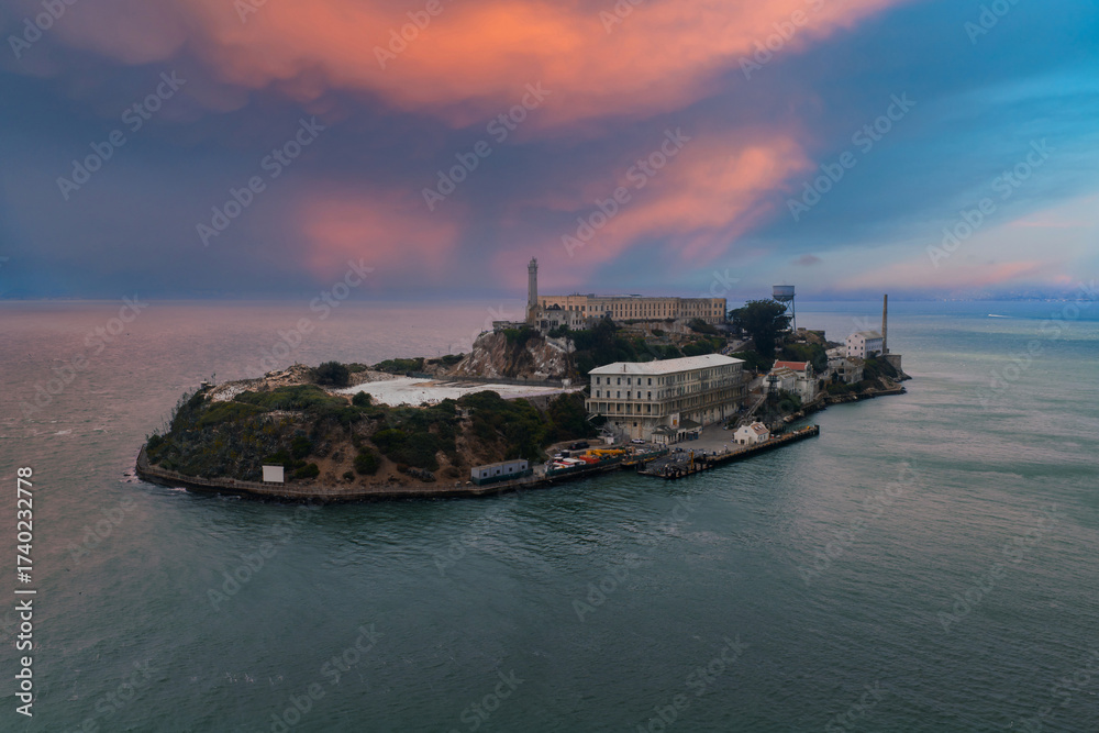 Aerial view of Alcatraz Island in San Francisco Bay, featuring the historic penitentiary, lighthouse, and vibrant sunset sky over surrounding waters.