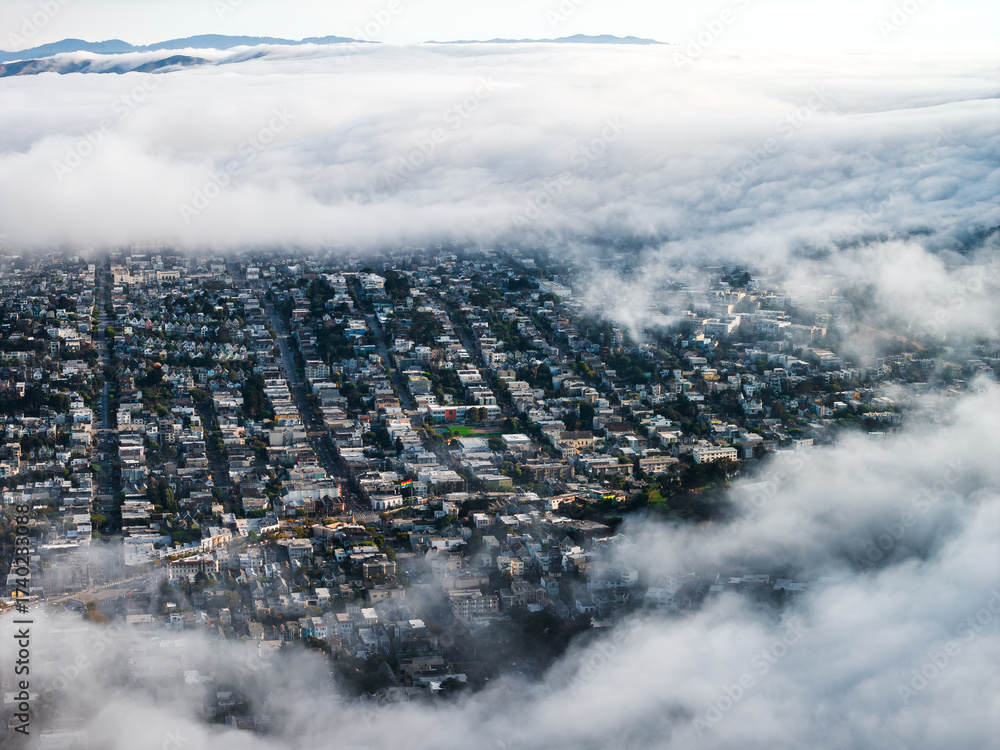 Aerial view of San Francisco's dense urban grid, partially covered by fog. Rows of buildings stretch across the landscape with hills in the background.