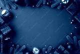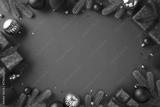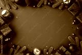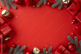 Vibrant red background framed by pine branches, gold and red baubles, and wrapped gifts ready for Christmas and New Year greetings