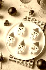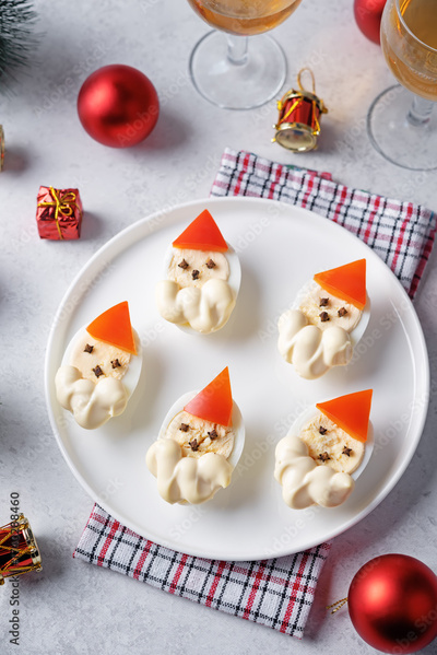 Boiled eggs with pepper and mayonnaise sauce in the form of Santa Claus for Christmas holidays