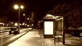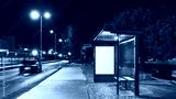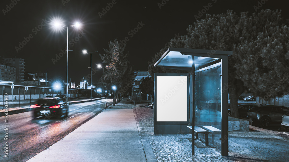 Blank illuminated mock-up poster at modern bus stop on empty urban street at night, captured with long exposure showing car light trails and glowing street lamps