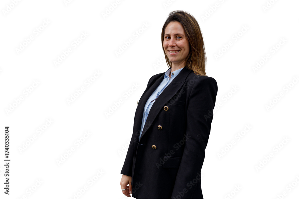 Professional woman in black blazer smiling, posing confident for business portrait, transparent background