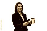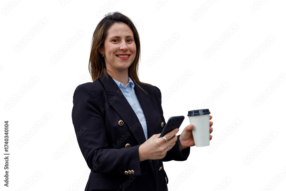 Professional businesswoman smiling, holding a mobile phone and a cup of coffee, emphasizing communication and corporate lifestyle