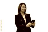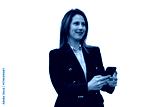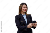 Professional businesswoman smiling, using smartphone, communicating on social media with transparent background