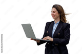 Businesswoman standing, smiling, and working on a laptop, using technology for remote corporate communication