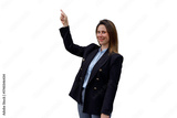 Woman businesswoman pointing up, presenting new ideas, making a presentation, smiling at camera with transparent background