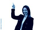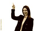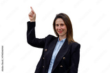 Businesswoman posing with index finger pointing up showing success, idea, and achievement notion