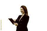 Businesswoman smiling, holding a digital tablet, managing business with technology. Transparent background