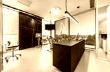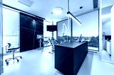Modern dental office interior with reception desk, patient chairs, treatment rooms and professional equipment. Bright clean environment designed for healthcare and dentistry services, including x-ray