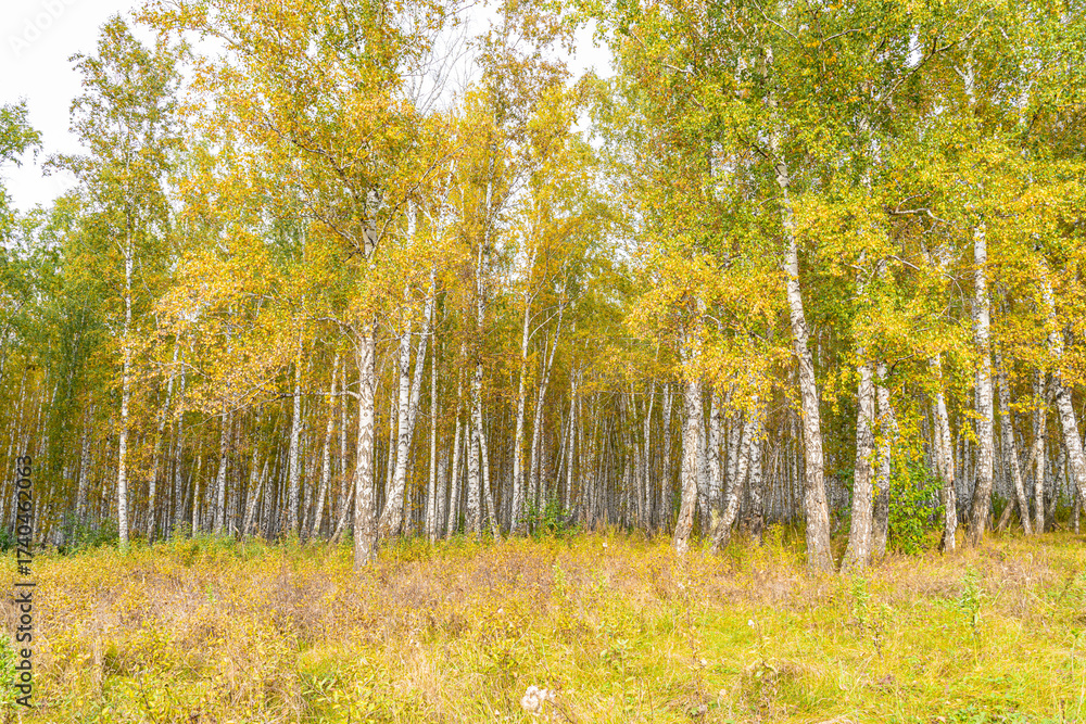 Autumn Birch Forest with Path Through Golden Trees in Fall Season