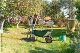 Garden Tools and Wheelbarrow on Green Lawn - Rake, Spade, Shovel and Bucket in Backyard