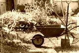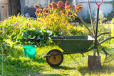 Garden Tools and Wheelbarrow on Green Lawn - Rake, Spade, Shovel and Bucket in Backyard