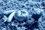 Autumn Harvest of Pumpkins, Zucchini and Pears in Red Bucket on Green Grass with Fall Leaves