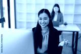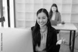 Happy young asian woman Call Center Person wearing a headset, providing support at a call center, smiling while typing on computer keyboard