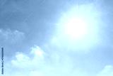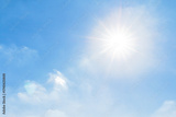 Bright sunlight shining in clear blue sky with lens flare and soft clouds, symbolizing freshness, good weather, and natural energy