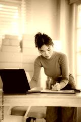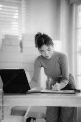 A young female entrepreneur managing online orders, packing parcels, and running a small e-commerce business with professionalism and happiness.