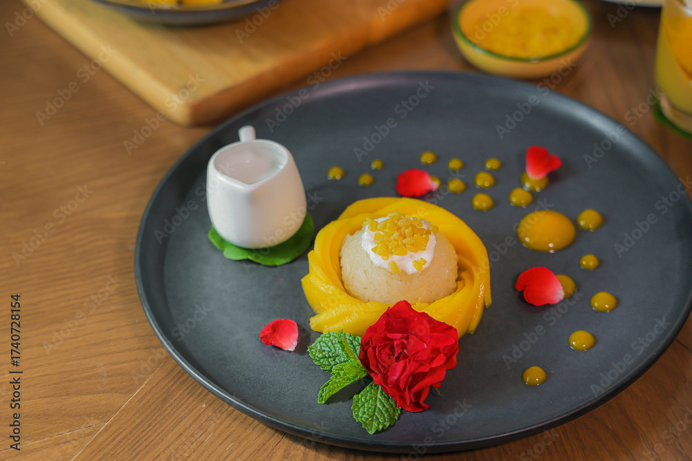 Mango Dessert: This exquisite mango dessert showcases the artistry of culinary creation, featuring a vibrant display of fresh mango slices, delicate garnishes.
