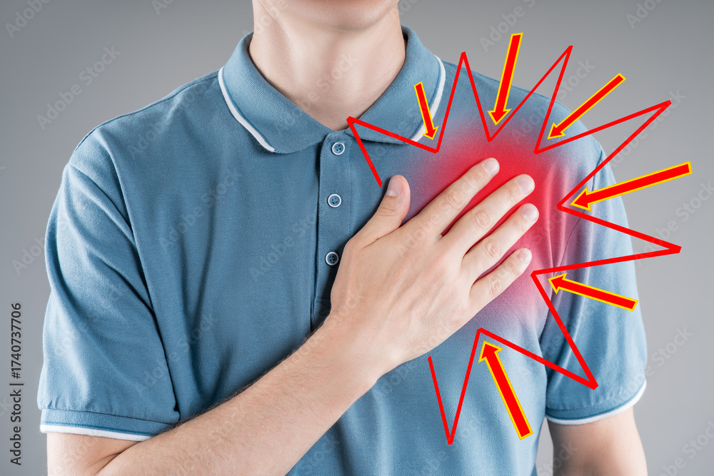 Dislocation of the shoulder, joint inflammation, arthritis and degenerative changes, man with pain in his arm on gray background