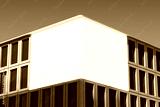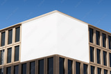 Blank white billboard mockup on modern building corner facade under clear blue sky for outdoor advertising and poster design concept display. 3D Rendering