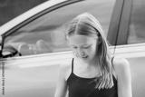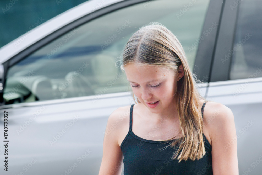 Young girl engaged in an activity near a parked car on a sunny day in an urban setting