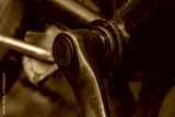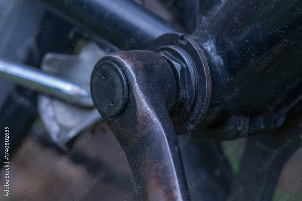 Old mounting pedal bicycle axle showcasing rust and wear details from years of use and exposure to elements