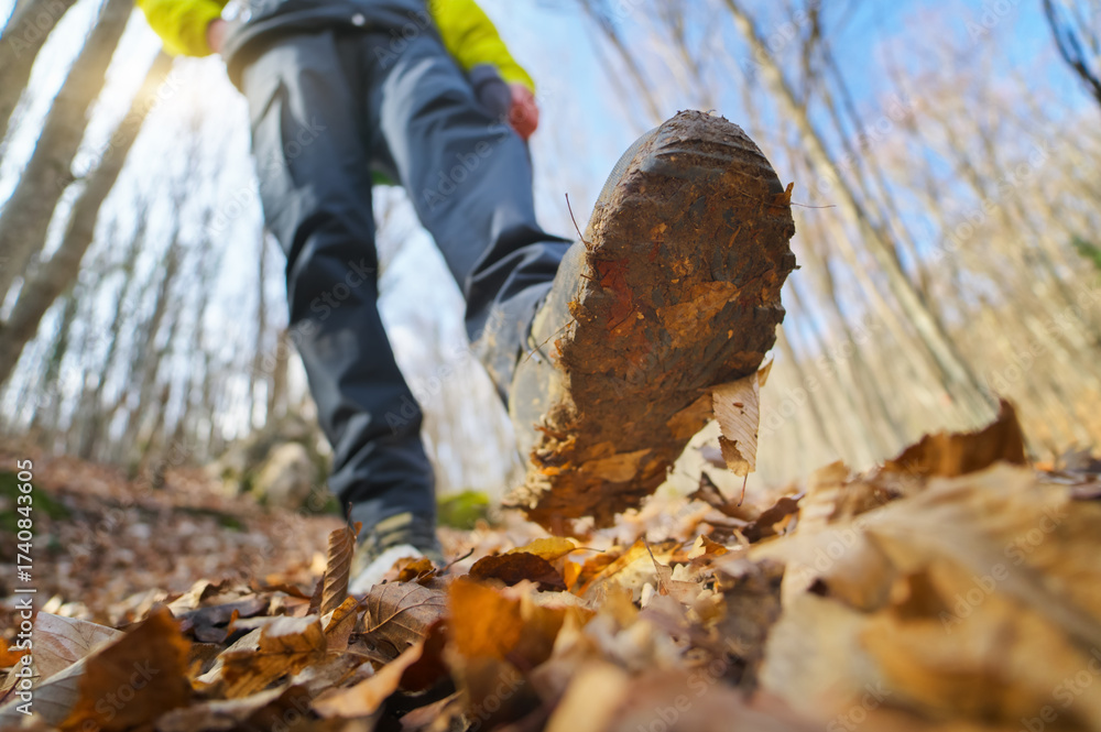Close-up of muddy hiking boots walking on a wet, dirt path.