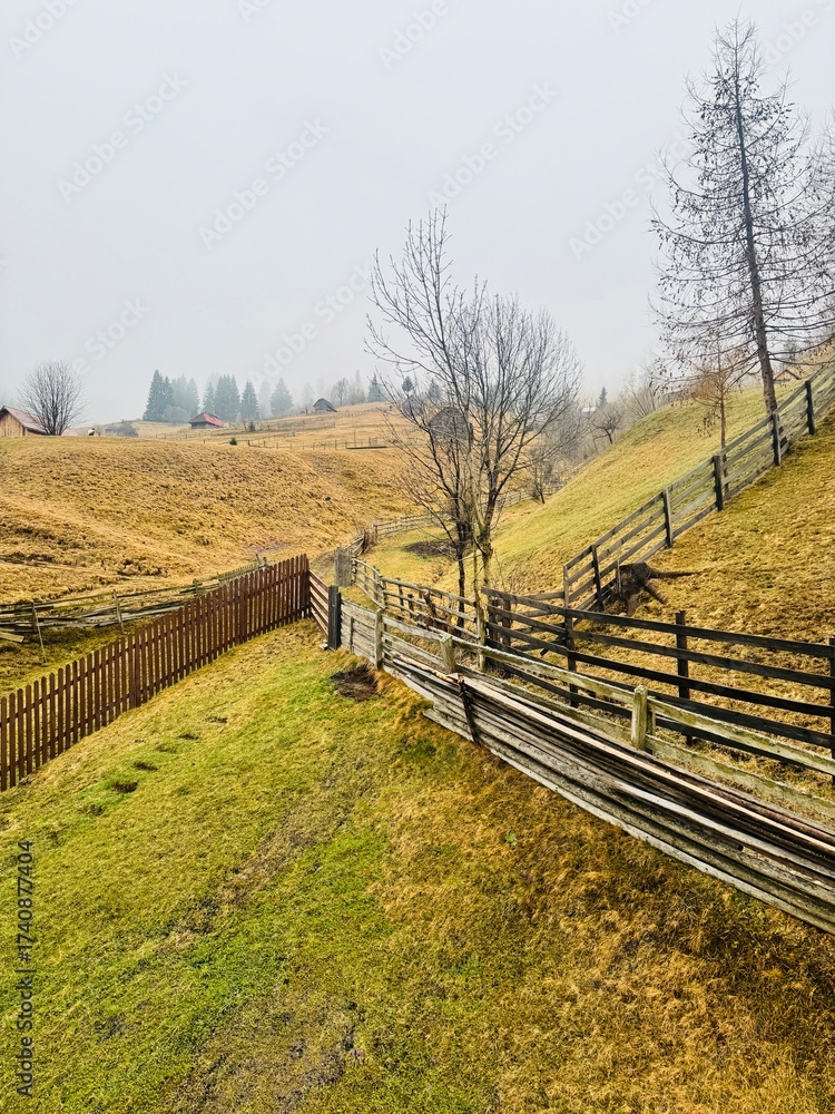 Overview of pastoral farmlands and mountain village in Brasov County, Romania