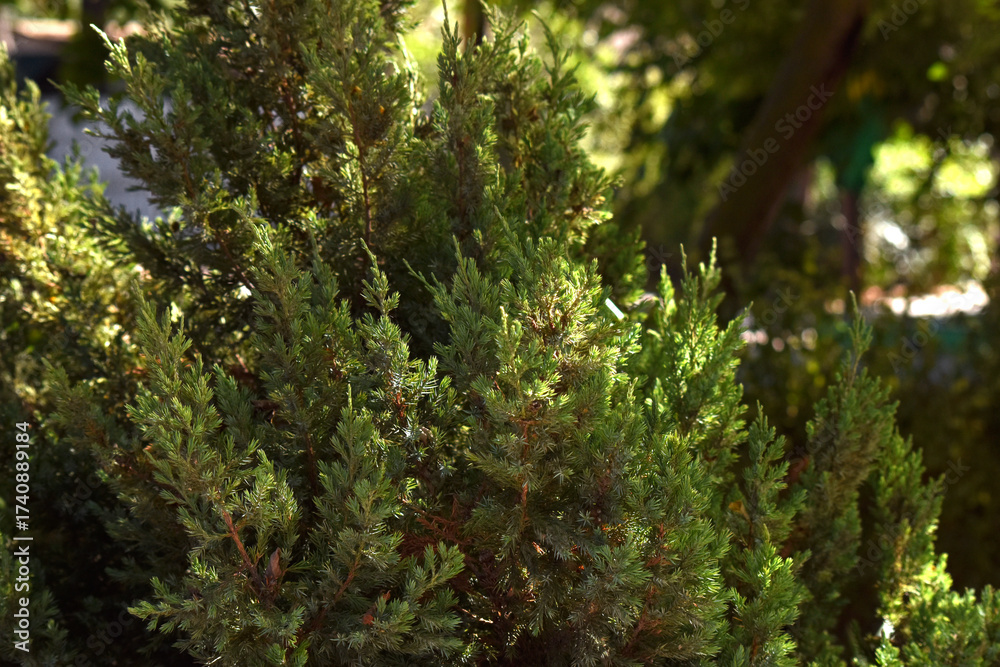 Evergreen Tree Branches Close-Up. Green coniferous tree branches in soft sunlight. Perfect for nature, forest, and eco design themes.