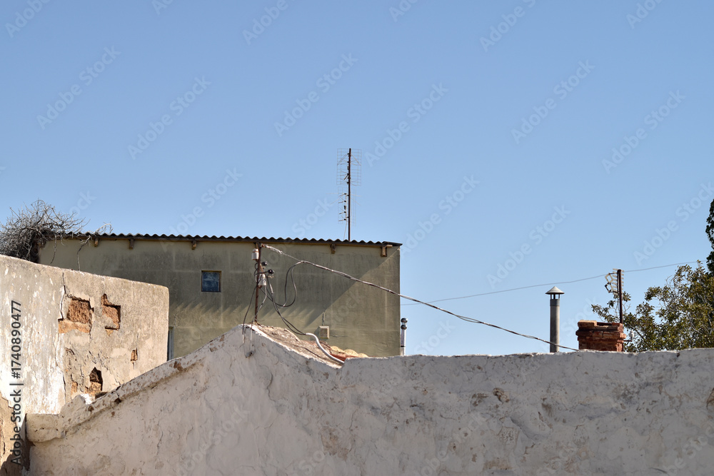 Old House with Blue Sky. Exterior view of an old house wall under clear blue sky, rustic urban architecture.
