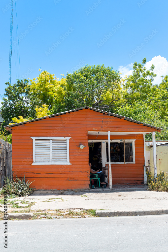 Pedernales, Dominican Republic, 8 august 2025. Typical Dominican Caribbean house made of wood, painted a bright red color.