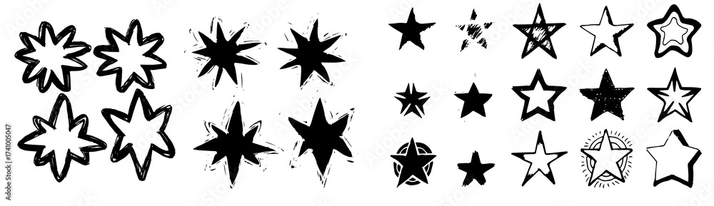 Black crayon hand drawn stars set. Childish doodled sparks and sparkles collection. Grunge rough brush stroke shine element pack for collage, poster, sticker. Kid sketched wax pencil symbols.