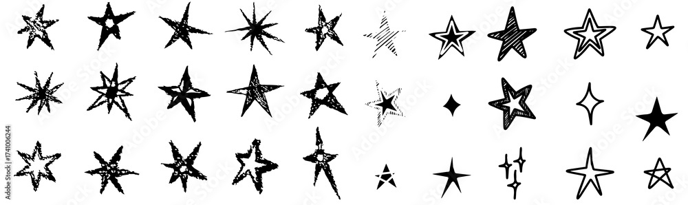 Black crayon hand drawn stars set. Childish doodled sparks and sparkles collection. Grunge rough brush stroke shine element pack for collage, poster, sticker. Kid sketched wax pencil symbols.
