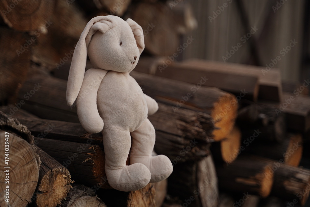 A soft beige bunny sits on a stack of firewood outside a home.