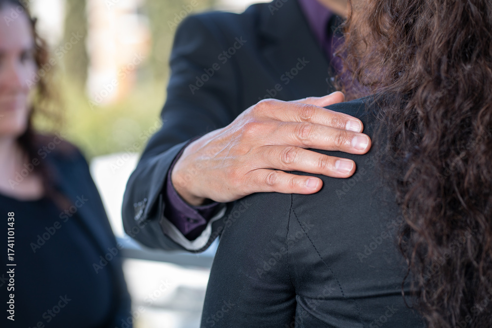 Funeral, support and people care for grief, mourning or depressed mother at burial ceremony, memorial service or cemetery. Hand, shoulder and man helping sad woman with love, advice or family comfort.