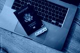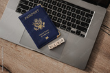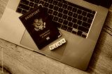 United States passport with wooden blocks spelling VISA on laptop keyboard, symbolizing travel authorization and immigration concept