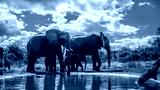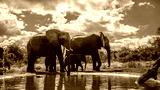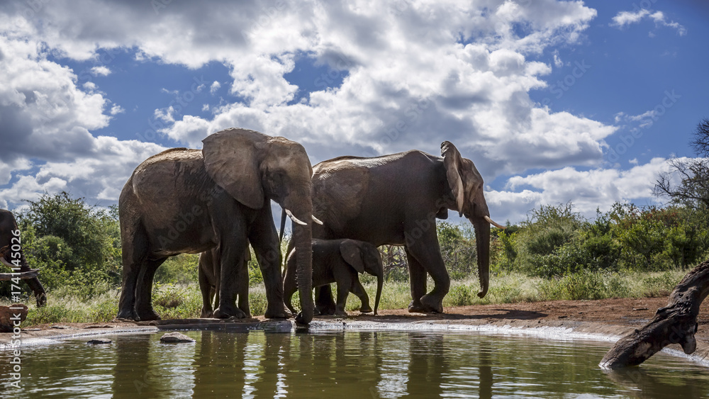 Two African bush elephants with calf along waterhole in Greater Kruger National park, South Africa ; Specie Loxodonta africana family of Elephantidae