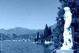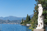 Views of lake Como with blue water, alpine mountains, beautiful villages, architectural details of sculpture, travel destination in North of Italy