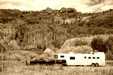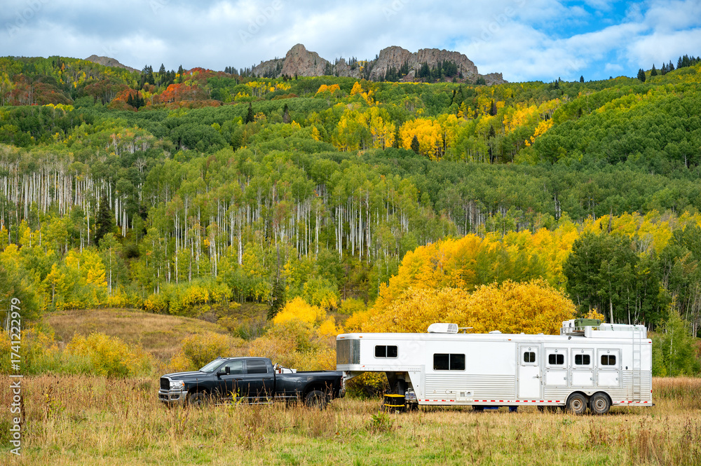 Pickup truck and travel trailer parking among colorful fall foliage of Kebler pass, a scenic mountain pass in the Rocky Mountains near Crested Butte, Colorado, USA. Camping travel in autumn season