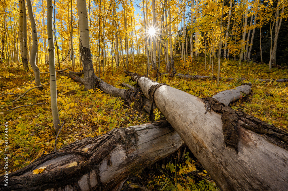 Sun shining through the yellow aspen forest with fallen trees trunk crossing on foreground during fall foliage. Beautiful golden autumn scenery in Colorado, United States